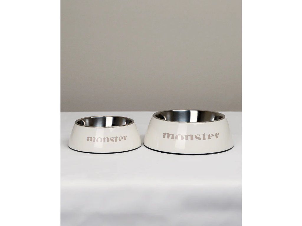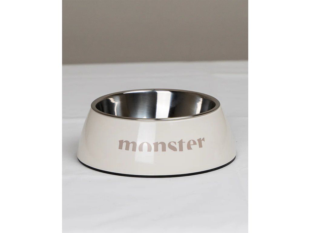 Nerezová miska s béžovým melaminovým základem a gumovým proužkem na dně pro stabilitu. Funkčnost se setkává se stylem v této praktické misce na jídlo a vodu, která zároveň pozvedá interiér o detaily ve stylu Monster.