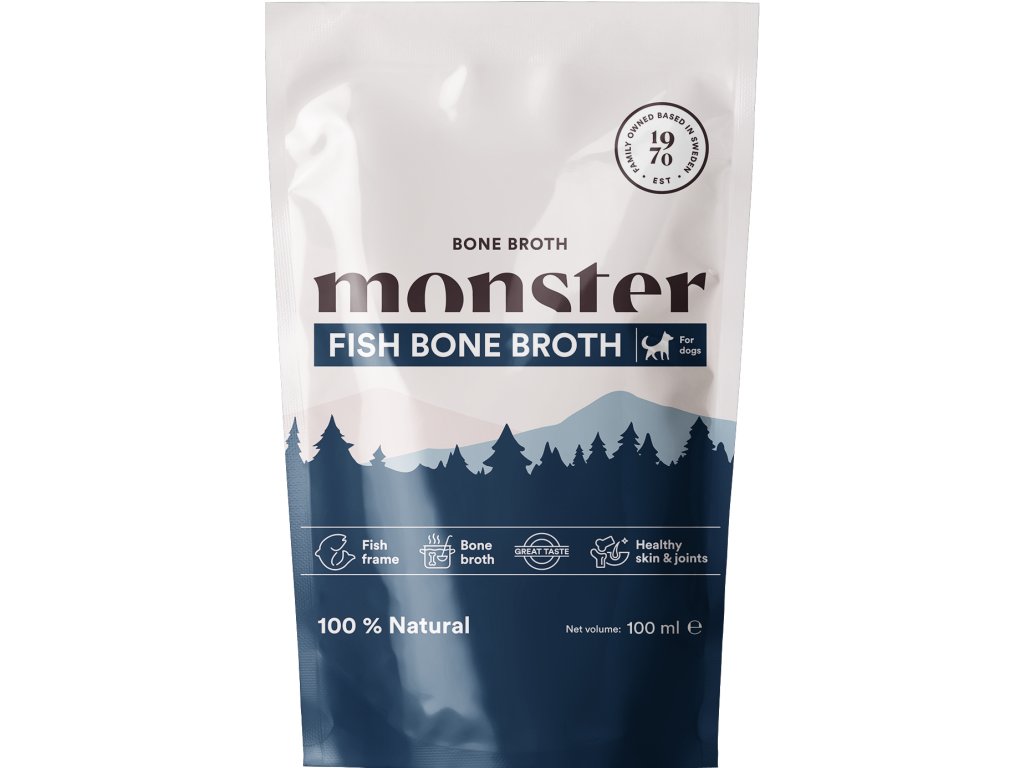 Monster Dog Vývar – rybí (100 ml) je lehký a dobře stravitelný doplněk stravy pro psy všech plemen. Vyráběný pomalým vařením ryb, díky čemuž si zachovává přirozenou chuť a cenné živiny.